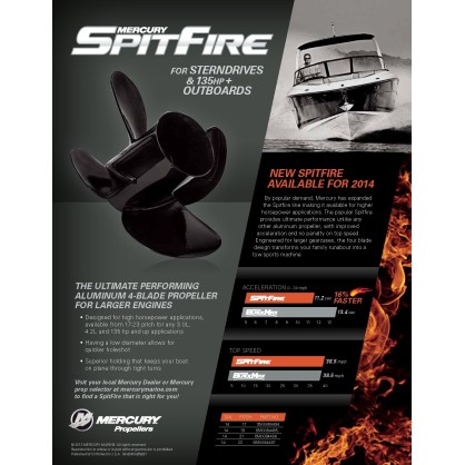Zeer geschikt voor de meeste sportboten met 4 cilinder 135 pk sterndrives, verwissel uw standaard 3 blad blackmax propeller voor een Spitfire met de zelfde spoed maat.